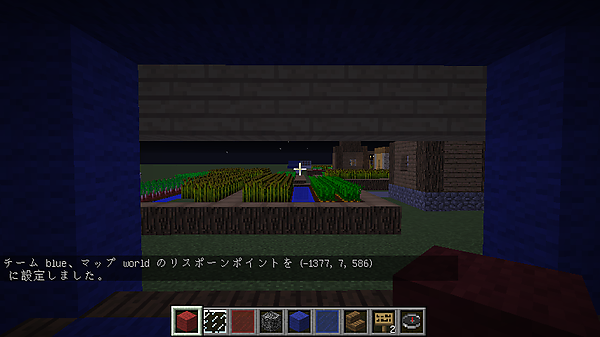 村の端にある青チームのスポーン地点に行き、以下のコマンドでスポーン地点を設定します。
