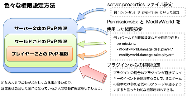 さらにBukkit(またはspigot)のプラグインからはワールドごとにPvPの有効/無効が設定でき、PermissionsEx+ModifyWorldなどの権限設定プラグインではプレイヤー個々人間での攻撃有効無効や一方的な攻撃可否なども設定可能です。生活サーバーやPvPサーバーなどでPvPの可否を設定する場合は、PermissionsExやその他のプラグインでワールドごとにPvPの可否を設定すると良いでしょう。