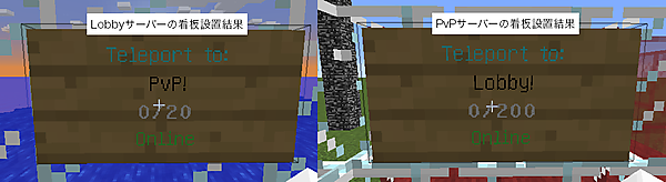 Lobbyサーバーでは、PvPサーバーへ移動するための看板を以下のような記述で設置します。