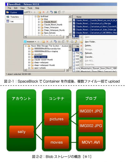 これらのGUIツールを使うことで「クラウド」を特別に意識することなくファイル操作が可能ですが、ストレージの構造は理解しておく必要があります。Windows Azure Blobでは、まずContainer(フォルダのようなもの)を作成し、その中にファイルを格納していきます。