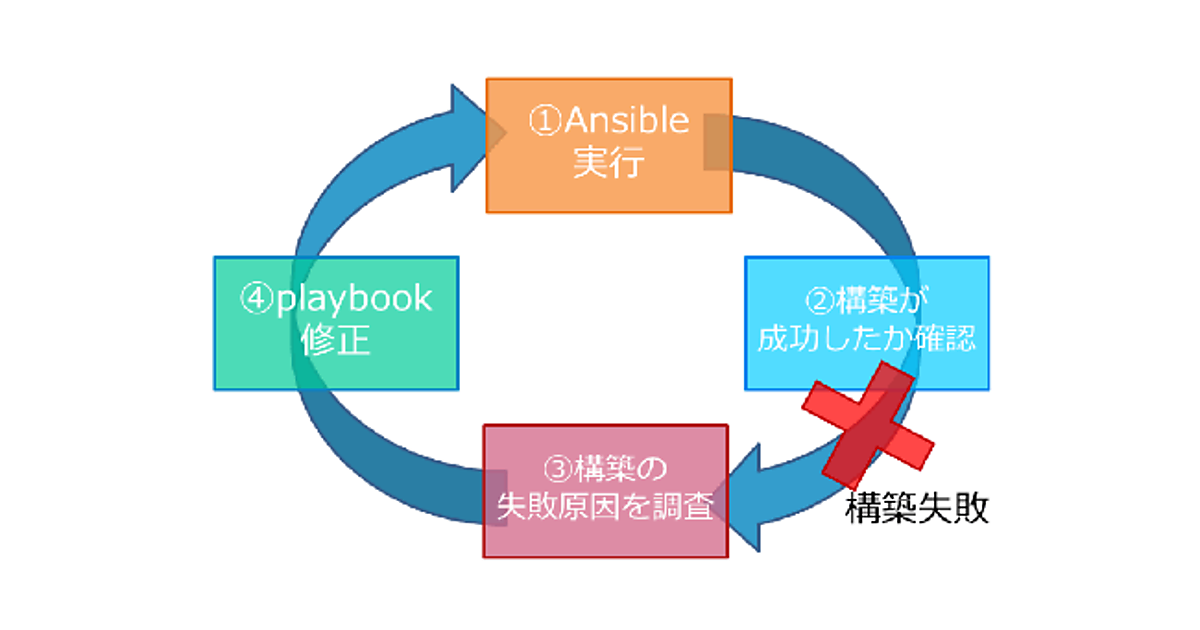 正しいPlaybookを作成する過程で、下図のようにAnsibleの実行と構築の確認を繰り返し行うことがあります。