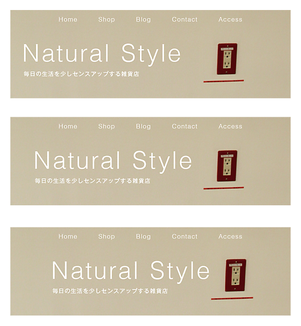 また“違和感を覚えさせない”ことは、実はデザインに求められる重要な要素でもあります。今回のトップページヘッダでも、一番伝えたいメッセージは“Natural Style”という言葉です。そこにだけ注目させるには、空間に違和感を覚えさせない方が良いですよね。そのあたりは、就職活動時のリクルートスーツと似ています。中身で判断してほしい学生や中身で判断したい企業にとっては、違和感のない空気のようなリクルートスーツは都合が良いのです。