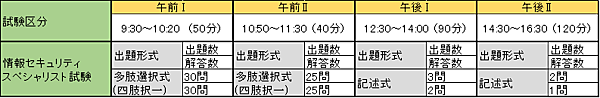 情報セキュリティスペシャリスト試験には「午前Ⅰ(多肢選択式)」「午前Ⅱ(多肢選択式)」「午後Ⅰ(記述式)」「午後Ⅱ(記述式)」の4つの時間区分があります(図1)。