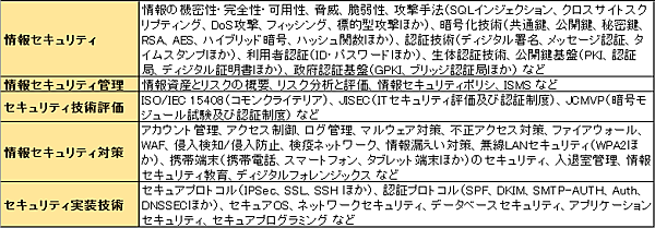 アクセス管理技術、暗号技術、認証技術、マルウェア(コンピュータウイルス、ボット、スパイウェアなど)対策技術、攻撃手法(ソーシャルエンジニアリング、サイバー攻撃など)、セキュリティ応用システム(署名認証、侵入検知システム、ファイアウォール、セキュアな通信技術(VPN ほか)、鍵管理技術、PKIなど。また、周辺機器も対象とする)、監査証跡のためのログ管理技術 など - 開発の管理に関すること