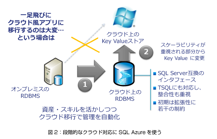 一声にマルチテナント化といっても、一足飛びに対応するのは難しいでしょう。まずはSQL Azureの特徴であるクラウドサービスとリレーショナル・データベースの2面性をうまく活用して、段階的に移行していくことをお勧めします(図2)。