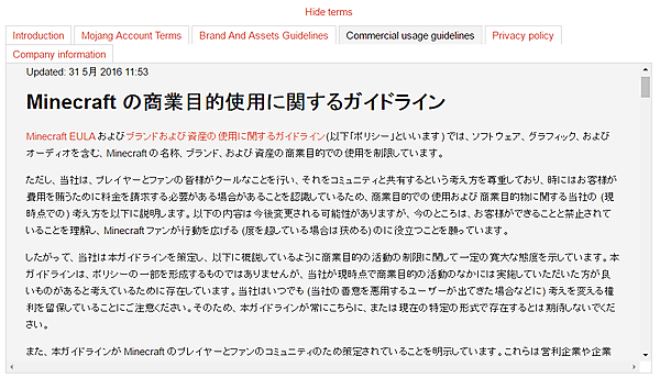MinecraftのEULA(エンドユーザー使用許諾契約)には、開発元のMojangが認めた収益を得られるMinecraftの使用範囲が定められたページがあります(図5)。Minecraftを通じた活動で収益を得るためには、本規約について詳細に理解した上で活動する必要があるでしょう。