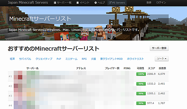 Minecraftのマルチサーバーを探す場合に利用されるサービスとして「マルチサーバーリスト」があります。国内で大規模なところでは「Japan Minecraft Servers」(図4)などが有名でしょう。ここではPC版やWindows10版、PE(PocketEddition)版に対応したマルチサーバーなども公開できます。
