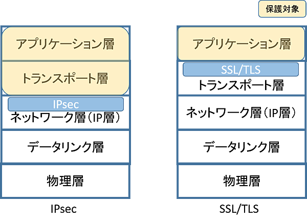セキュリティプロトコルでは、特に「どこの層でセキュリティを実現しているか」が重要で、それにより保護対象も変わってきます。IPsecはIP層レベル、SSL/TLSはセッション層(トランスポート層とアプリケーション層の間)で機能し、保護対象はその上位層です(図1)。このような違いもしっかりと押さえておきましょう。