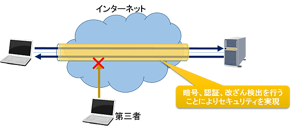 IPsecによるインターネットVPNの場合は暗号や認証、改ざん検出を行うことにより第三者の介入を防ぎ、相手と自分の間に閉じた空間を作り出すことができます(図2)。
