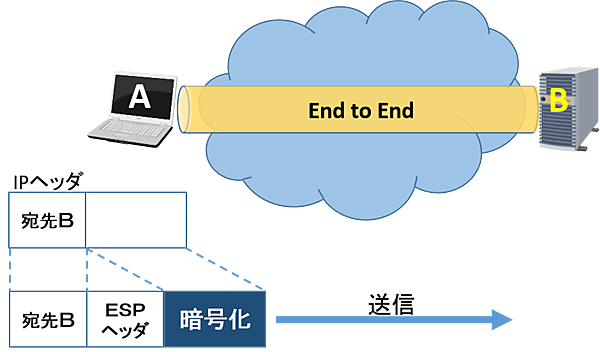 IPsecには「トランスポートモード」と「トンネルモード」の2つの動作モードがあります。End to EndでIPsecのVPNを行う場合はトランスポートモード、サイト間やクライアント-サイト間の通信にはトンネルモードが使用されます。