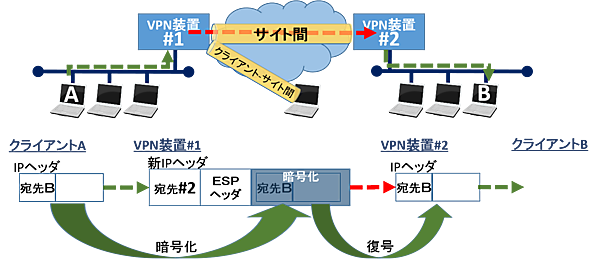 また、トンネルモードでESPを使用して暗号化通信した場合は、図5のように「VPN装置#1」と「VPN装置#2」の間で暗号化します。「VPN装置#1」で「クライアントA」が発信したIPパケット全体を暗号化し、新しいIPヘッダを付けて「VPN装置#2」に送ります。「VPN装置#2」では、受信した暗号化パケットを復号処理し、「クライアントB」へ送信します。
