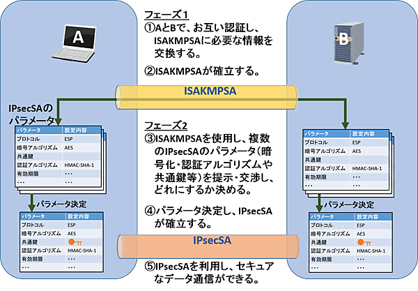 ISAKMPはSAを確立するために「フェーズ1」「フェーズ2」の2つのフェーズで処理を行います(図7)。各フェーズの目的は以下の通りです。