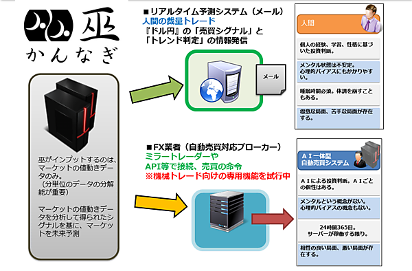 「巫」では、自動売買対応のFX会社向けにミラートレーダーやAPI等での売買命令、MT4 EA(Expert Advisor)等での機械トレードなどを試験研究中です(図3)。自動売買の仕組みを一般個人投資家に提供するには技術的なハードルに加えて法律的なハードルも越えなければならないため、金融関連会社との提携等が重要になります。