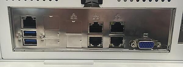 図7:Xeon Dマシンのバックパネル。VGAのほかGbE LANポート2つ、10GbE LANポートが2つ、USB 3.0ポートが2つある。左に見えるRJ45はIPMI用のポートで、電源のオンオフやリモートコンソール機能などをLAN経由で使える