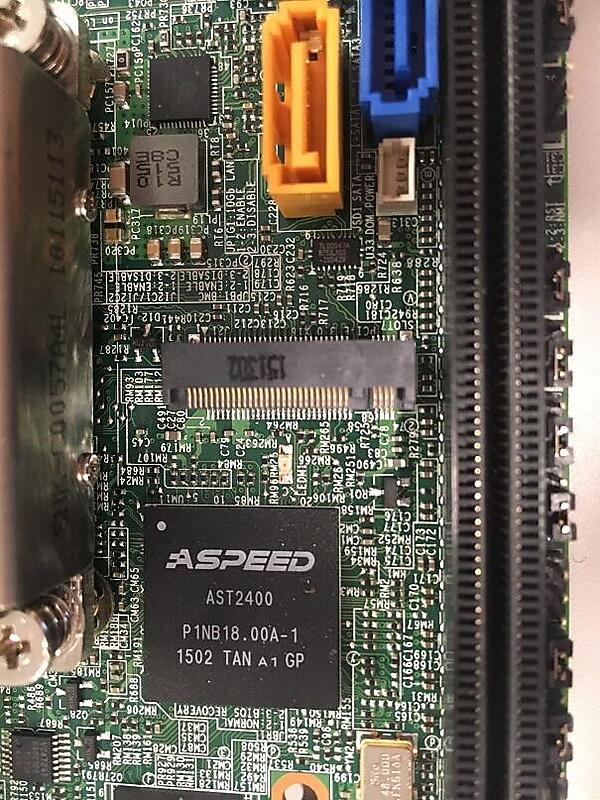 図9:Xeon Dマザーボードの一部拡大写真。中央に見える黒い端子がM.2、上部のオレンジ色の端子がSATA、右に見えるのがPCI Express。そして「ASPEED AST2400」というIPMI対応チップが載っているのが見える
