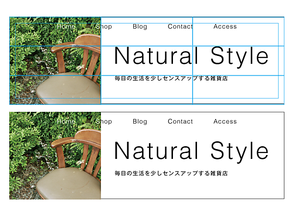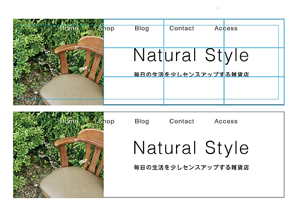 例えば、図4で「少しタイトルが大きいかな?」と感じて「タイトルを小さくして比較してみたい」と思ったら、図5のように今度はホワイトスペースだけを縦に三分割してみます。そして“Natural Style”の大きさ(幅)がホワイトスペースの幅の2/3くらいの大きさになるように小さくし、場所はセンターに配置します。タイトル(Natural Style)とキャッチコピー(毎日の生活を少しセンスアップする雑貨店)の大きさが近くなったので、キャッチコピーはタイトルの幅に合わせて上下左右のホワイトスペースがほぼ同じくらいのセンターに配置すれば、バランスが取れたレイアウトになります。