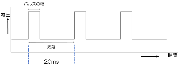 周波数はパルスがHIGHからLOWへ往復し、またHIGHになるまでの幅(周期)、デューティー比はパルスがHIGHからLOWになるまでの時間(パルスの幅)と周期との比率です(図4)。HIGHのパルスの幅(時間)が周期幅(20ms)に対してどの程度であるかを百分率で表します。