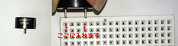 通常、照度センサはLEDと同じ金属の足が2本の部品ですが、コネクトコードの両端を照度センサとピンヘッダに圧着しました。赤が+(Vcc側)、黒が−(GND側)です(図46)。