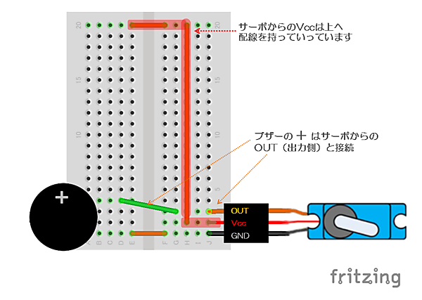 続けて圧電ブザーを接続します(電子工作キットに付属しています)。ブレッドボードの端に挿し込みます(図17)。サーボ側とブレッドボード、ブザーも接続していきます(図18)。少し配線が入りくんでいるので、実体配線図も確認してください(図19)。