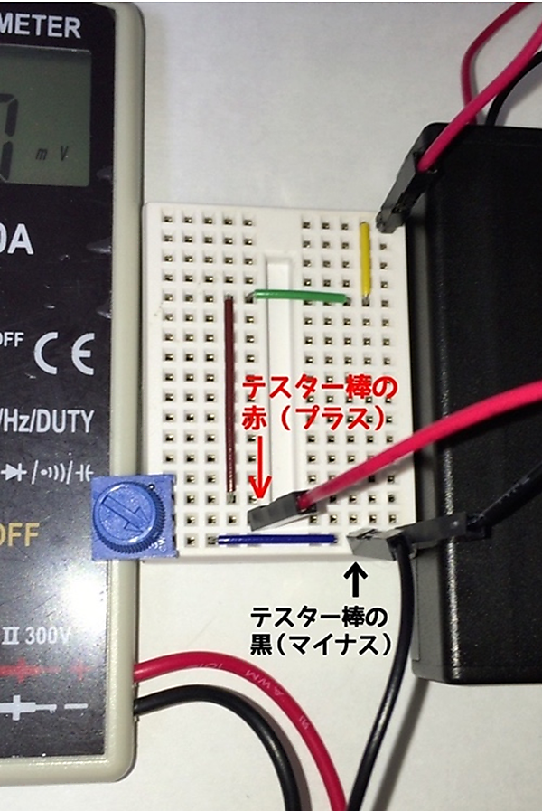 最後に、抵抗の照度センサ側にテスター棒の赤(+)を、電池ボックス側にテスター棒の黒(−)を繋げて(図49)、電源をONしてみましょう。