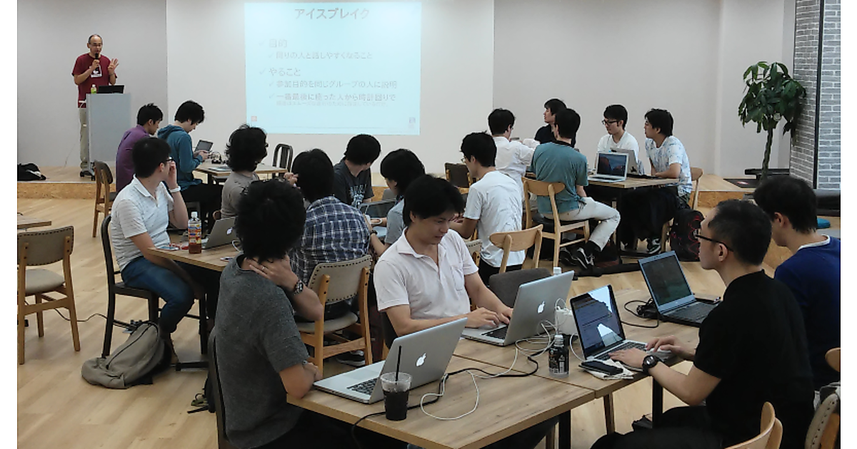 ワークショップが始まると、各自がノートPCやMacBookを持って席に着きました。このとき、メンターの両隣にビギナーが座るという形で始まりました。最初は、アイスブレイクを兼ねた自己紹介です。日ごろ、どんな開発に関わっているかとか、使っているプログラミング言語とかを紹介すると、みんなエンジニアなので、かなり盛り上がっていました。