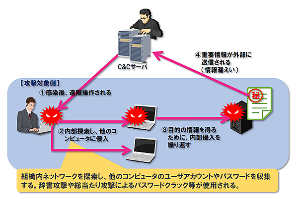 感染したコンピュータを遠隔操作し、そのコンピュータを起点にさらに内部のコンピュータへ侵入を繰り返します。 - 情報窃取(情報漏えい)