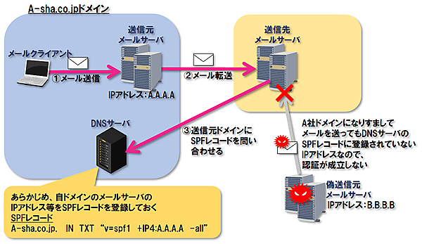 図4のケースではA-sha.co.jpドメインのメールサーバのIPアドレスは「A.A.A.A」のみで、それ以外はこのドメインの送信メールサーバとして認証しないことになります。よって、A-sha.co.jpドメインから発信されたメールを受け取った「送信先メールサーバ」では③でA-sha.co.jpドメインのDNSサーバに問い合わせし、A-sha.co.jpドメインのメールサーバのIPアドレスを確認します。③で確認したIPアドレスと②の送信元メールサーバのIPアドレスが一致していれば認証が成立し、詐称されていないことがわかります。