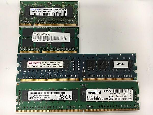 図5:上から順に512MB DDR2 SO-DIMM、4GB DDR3 SO-DIMM、1GB DDR2 DIMM、8GB DDR4 DIMM。それぞれ切り欠きの位置が異なるのが分かる。一番下のDDR4はECC付きのRDIMMで他はUDIMMだ