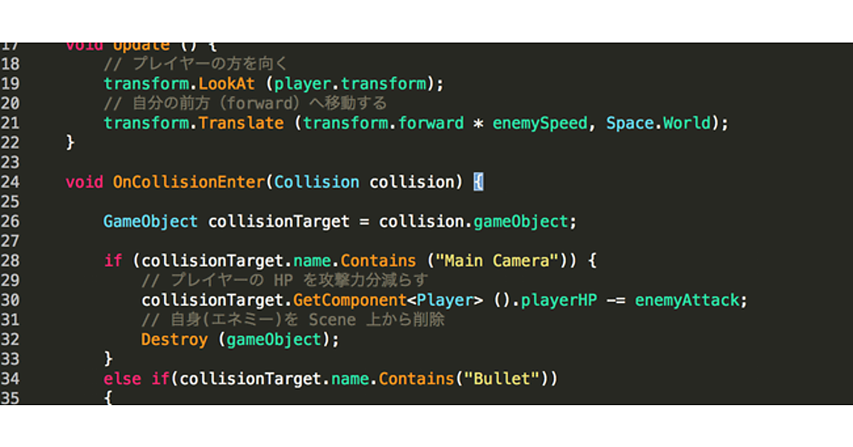 EnemyクラスでOnCollisionEnter(Collision 衝突)を使って実装していく。引数のCollisionで衝突した相手のゲームオブジェクト名を取得できるので、プレイヤーに衝突した場合と弾丸で撃墜された場合とで処理を分けることができる。Destroy()関数はMonoBehaviour関数の1つで、引数に指定したゲームオブジェクトをScene上から削除できる。ここでは、プレイヤーに衝突・もしくは弾丸と衝突した場合に自身を削除するようにしている。