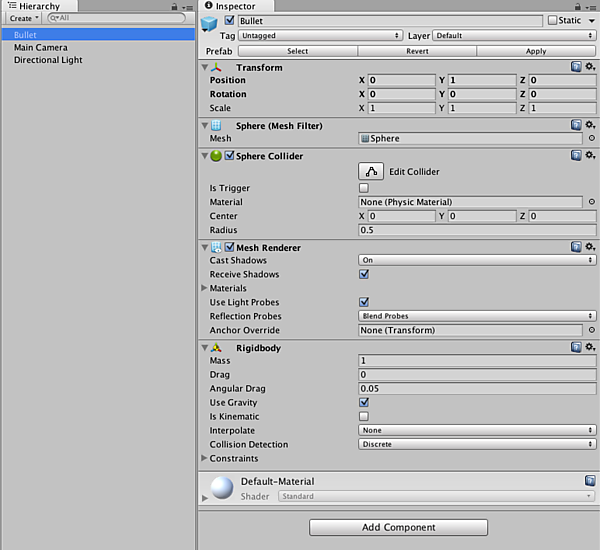 今度は、画面タップもしくはコントローラのボタンを押すとプレイヤーから弾丸が発射される仕組みを実装していく。まずは、弾丸となるゲームオブジェクトを作成しよう。Hierarchy ViewでCreate > 3D Object > Sphereを作成し、名前をBulletとする。BulletにはInspectorからAddComponentボタンをクリックしてRigidbodyコンポーネントをアサインしておく。その後Project Viewにドラッグ・アンド・ドロップしてプレハブ化したら、Hierarchy View上からは削除しておこう。