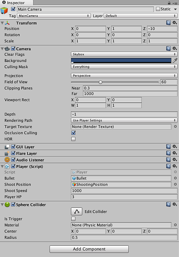 また、Main CameraオブジェクトにAddComponentボタンからSphere Colliderコンポーネントをアサインしておこう。このColliderは衝突判定を行う際に必要で、後述するエネミー機能の実装で使用する。