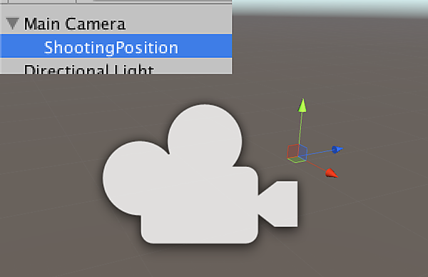 次に、先程作ったBulletを発射するための「場所」をMain Cameraに定義しよう。Hierarchy ViewでCreate > Create Emptyし、名前をShootPositionとする。ShootPositionをMain Cameraにドラッグ・アンド・ドロップしてMain Cameraの子ゲームオブジェクトにしたら、ShootPositionのPositionをMain Cameraの少し前方に置かれるように調整する。