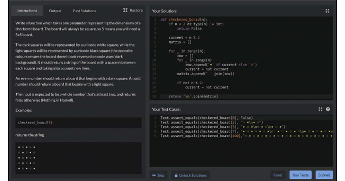 それだけではなく、あまり使用したことのないプログラミング言語に慣れるためにも、良い方法です。CodeWarsには、難易度や使用言語別のカテゴリーに分けられた課題が数多くあります。