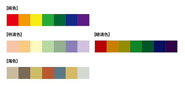純色に白が混ざると“明清色”、黒が混ざると“暗清色”と言われ、濁りのない“清色”として括られます。さらに、純色にグレイが混ざると“濁色”(中間色)と言われたりします。