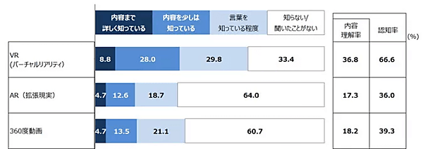 結果の主なポイントとして、VRに対する内容理解度では、全体の8.8%が「内容まで詳しく知っている」と回答、「内容を少しは知っている」を含めた「内容理解率」は36.8%に達したとのことです。さらに「言葉を知っている程度」までを含めた認知率は66.6%となりました。一方で、「AR」や「360度動画」については、それぞれ40%程度の認知率であり、内容理解率はVRの半分程度になっています。