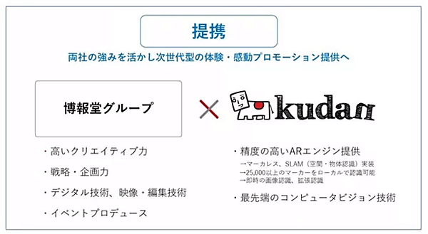 またAR領域では、マーカーレス空間認識が可能な開発キット「Kudan AR Engine」を提供する、KudanLimited(英国)の日本法人kudan株式会社との提携を発表しました。博報堂は今後VR、ARのみならず、MR(Mixed Reality)の研究・活用を進め、それら技術を活用したプロモーション提供を行っていく予定とのことです。