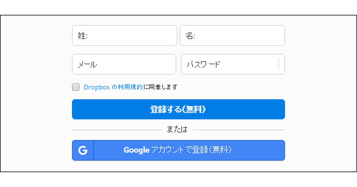 Dropboxのアカウント作成は名前・名字(両方必須)とメールアドレス・パスワードを設定するか、Googleアカウントを所持している場合はそれを使用して登録することができます。