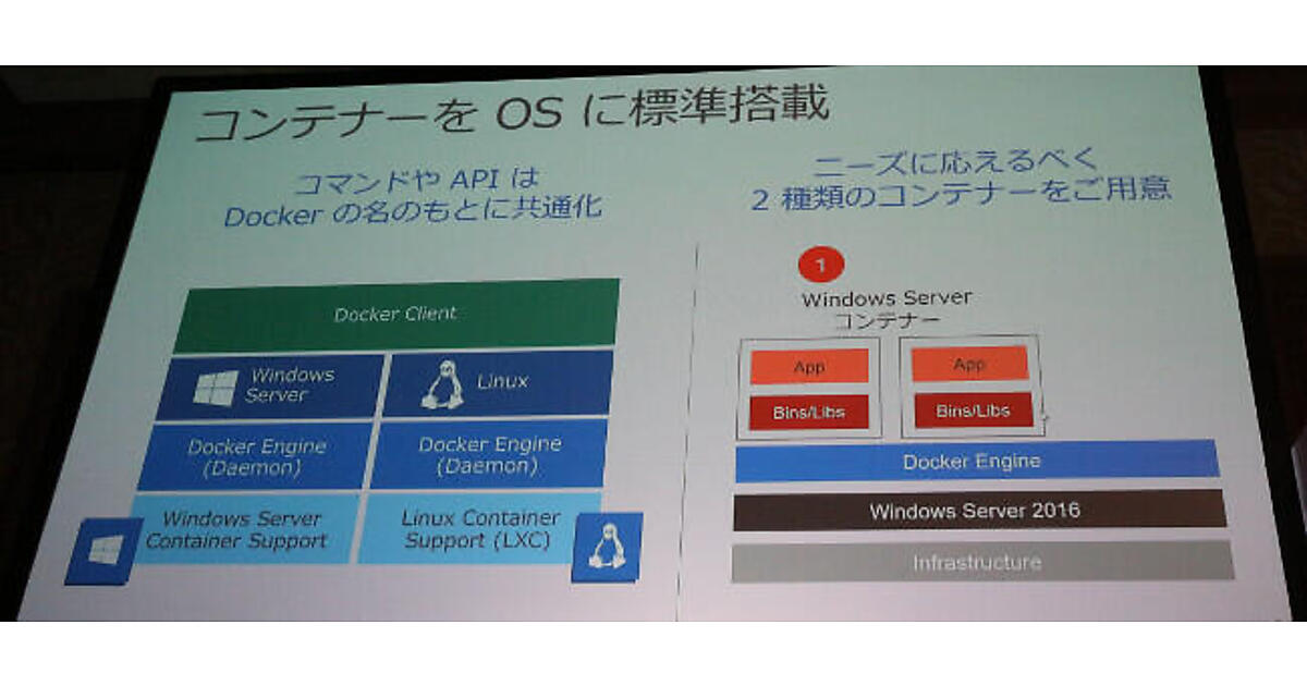 その後に、ITプロフェッショナルからの「オープンソースソフトウェアの最新技術のほうが便利だよね」というコメントを紹介した上で、Docker EngineがWindows Server 2016の上で稼働していることを紹介した。ここでは最近のコンテナテクノロジーがアプリ開発及び本番環境での稼働に大いに影響を及ぼしていることを認識した上で、マイクロソフトとしてはそれにどう対応しているのか? という問いに答えを出した形だ。
