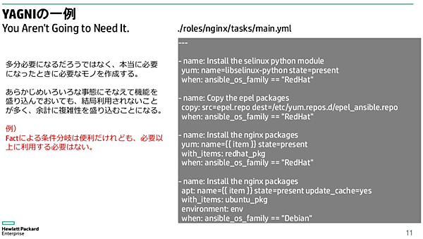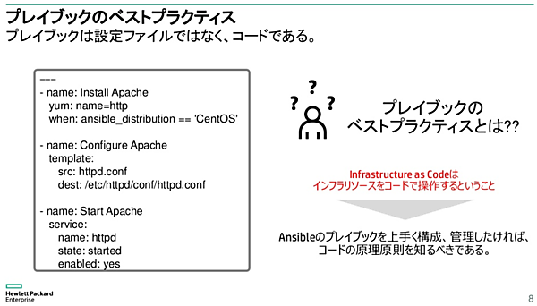 北山さんは、Ansibleのプレイブックは設定ファイルではなくコードだと言います。