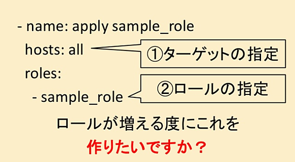 「ロール実行用のplaybookの作成って面倒!」とbbrfkrさんは言います。上記のように、ロールを対象サーバに適用するだけのためのplaybookを書く必要があり、しかもロールごとに書かなければいけません。