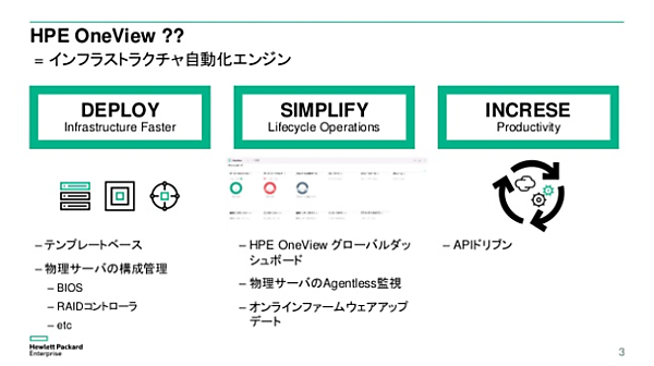 そもそもHPE OneViewとは、ヒューレットパッカードの開発したインフラ自動化エンジンです。物理ハードウェアのセットアップや運用などを幅広く行うことができます。