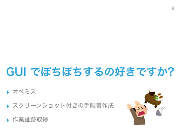 Ansibleは、デプロイの自動化に利用されることが多いそうです。でも普段の運用でも使えるはずですよね。運用にはサーバーの再起動のような定常業務と、トラブルシュートのような非定常業務がありますが、向いているのはもちろん定常業務のほう。