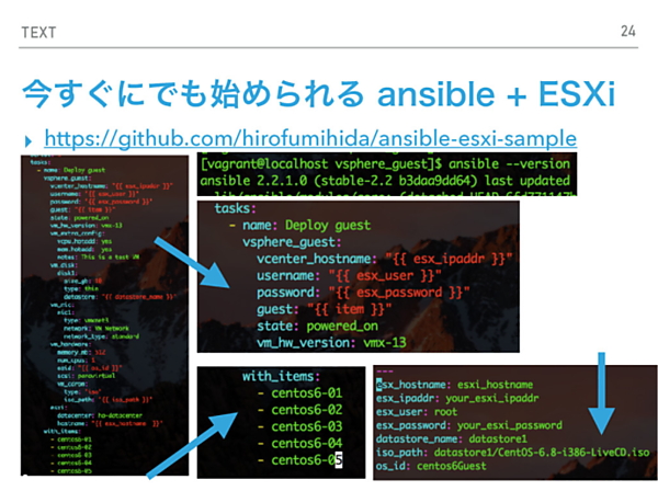それをつかえば、たとえばESXi上にCentOSの仮想マシンを6台立ち上げる、といったようなplaybookも作れます、とのことでした。