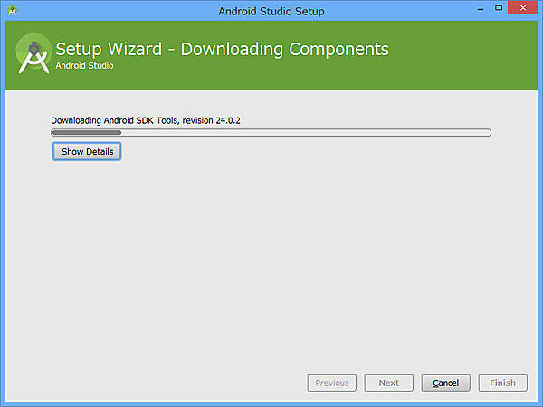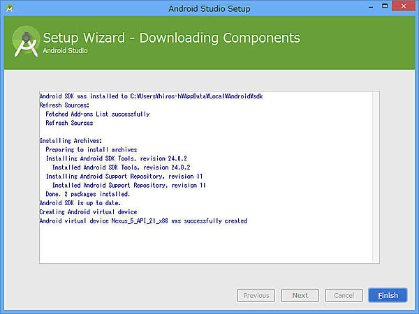 これで、Android Studioの基本部分のインストールは終了です。[Start Android Studio]にチェックマークを付けていれば、そのままAndroid Studioが起動できます。引き続き、初期設定を済ませます。初期設定では、必要なバージョンのAndroid SDKやAndroid仮想デバイスをダウンロードします。作業はほとんど自動的に進められます。