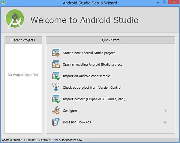 おめでとうございます!すべての準備が整いました。次回からは、Android Studioを起動すると上の画面が表示され、すぐにAndroidアプリの作成に取りかかれるようになります。長い長い道のりでしたが、これでAndroidアプリの作成と実行が思う存分できますね!
