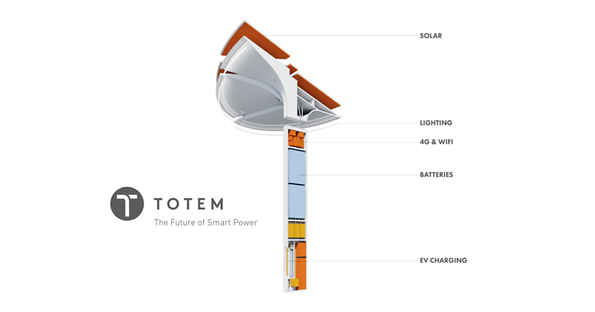 Totemの構想のカギは、スマートシティのエネルギーへのアクセスと通信を加速させるテクノロジーが詰まった、18フィート(約5.5m)の太陽光発電ポールだ。