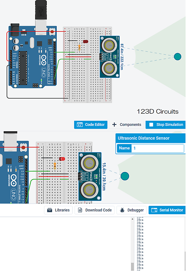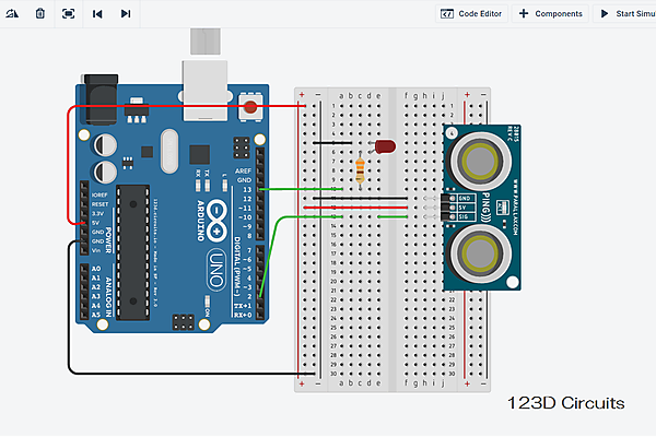 それでは、さっそく超音波センサの動作を確認してみましょう。まず、123d Circuitsで壁などの障害物に一定距離近づいたらLEDを点灯するシミュレーションを行います。今回使用する部品は、以下の5点です。抵抗は忘れずに数値を設定しておきましょう。実体配線図は、以下のとおりです。配線が終了したら、画面上部の「Code Editor」をクリックして、以下のスケッチを記述します。