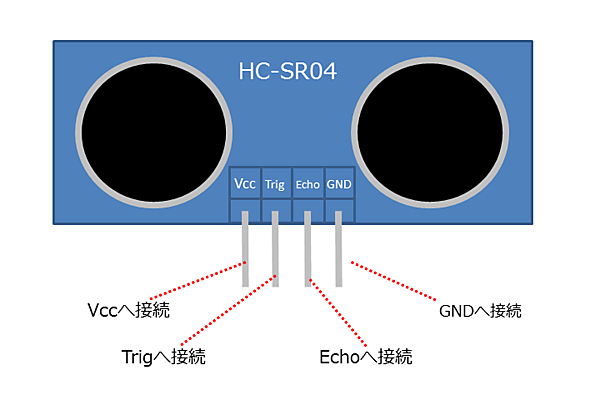 SIGピンはなくTrig(トリガー)とEchoピンがあります。Parallax社製の超音波センサはSIGでパルスの送受信を1つのピンで行っていましたが、HC-SR04ではそれぞれTrig(パルスの送信)とEcho(パルスの読み込み)で行っています。VccはParallax社製と同様にArduino Unoの5Vに接続します。