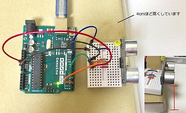 }スケッチを記述できたら、設置位置を地面から少し高くしておきましょう。超音波の測定角度が15度なので、地面から少し高くしておかないと下側の対象物(地面)を検知してしまいます。