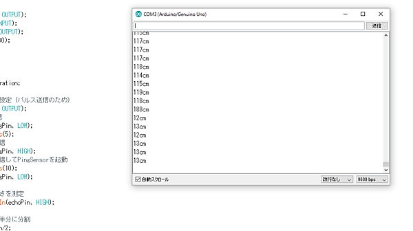 Arduino IDE上で [ツール] → [シリアルモニタ]を確認すると、対象物との距離が表示されます。